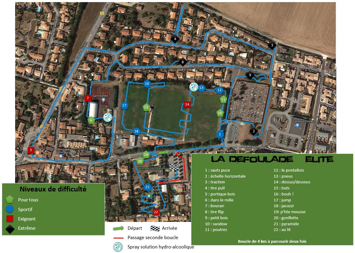Une boucle de 4km à parcourir 2 fois sur laquelle sont répartis 22 obstacles. Parcours Élite